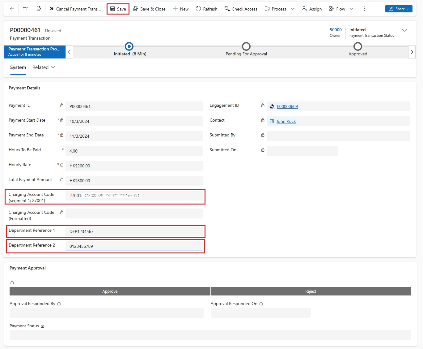 Step 6: Enter "Charging Account Code", "Department Reference 1", "Department Reference 2" as appropriate and press "Save" to validate the input