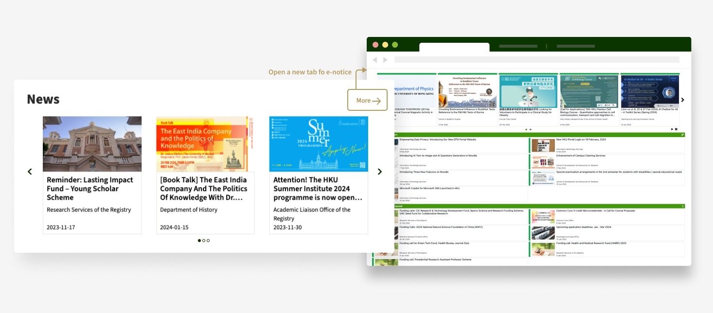 The Portal showcases highlighted news with images, retrieved from the eNotices system. To view more news, users can click "More," which directs them to the eNotices system webpage.