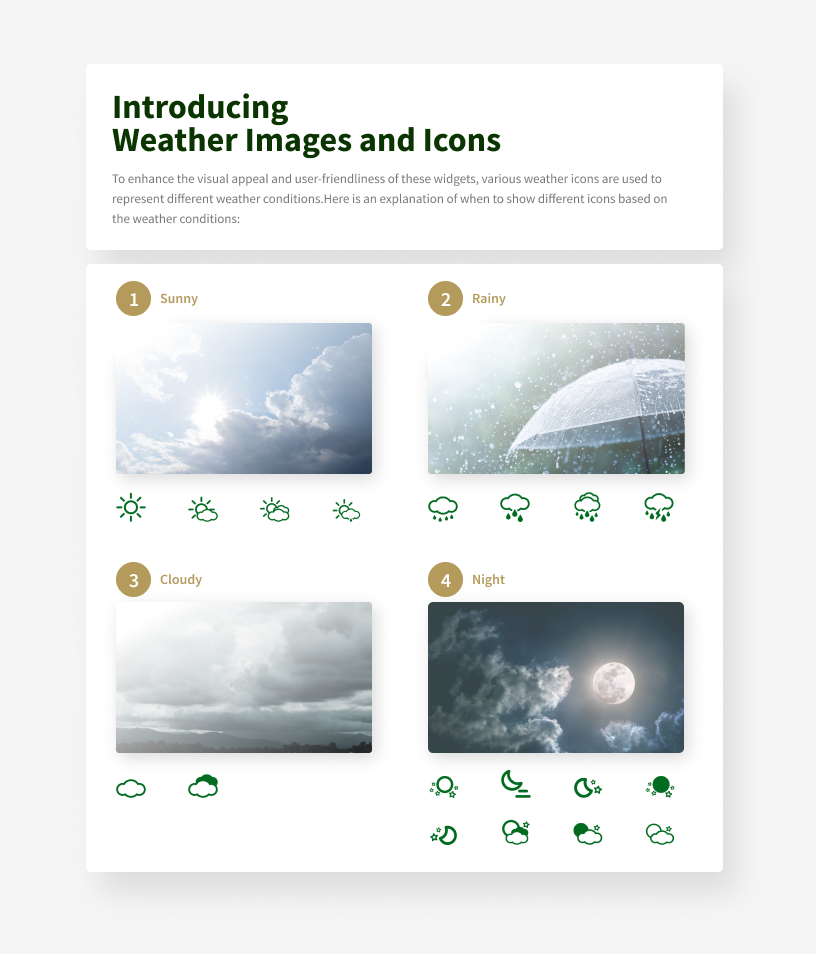 To enhance the visual appeal and user-friendliness of these widgets, various weather icons are used to represent different weather conditions.Here is an explanation of when to show different icons based on the weather conditions: